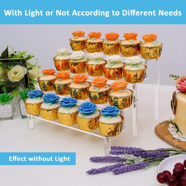 This dessert stand is made with superior quality, highly durable acrylic material. Four tiers are laid out in a step formation. The stand can hold a maximum of approximately 16 cupcakes. LED lights are optional.