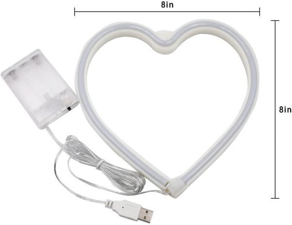 Made of soft neon tube, this home decor light is warm, soft, comfortable and artistic. USB (included) and 3 AA batteries (not included) power supply, Low energy consumption and long lifespan. You can either use batteries or put it in power bank, USB port, computer etc. There is a pre-drilled hole for easy hanging. You can hang it anywhere indoor you prefer. Approximate 8″x8″x0.75″, with a total 70″ long leading wire.