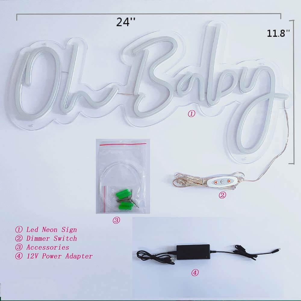The neon Oh Baby sign lights are made of colored silicone tubes and acrylic bottom plate. Compared with traditional glass neon lights, it is brighter, safer, environmentally friendly, durable, power saving, no noise, no heat and easy to use in various scenes. This neon Oh Baby sign comes with a crystal line and DC12V2A adapter, just mount and plug in. Press the power key to light up the neon sign, press the arrow key to adjust the brightness. Indoor use only.