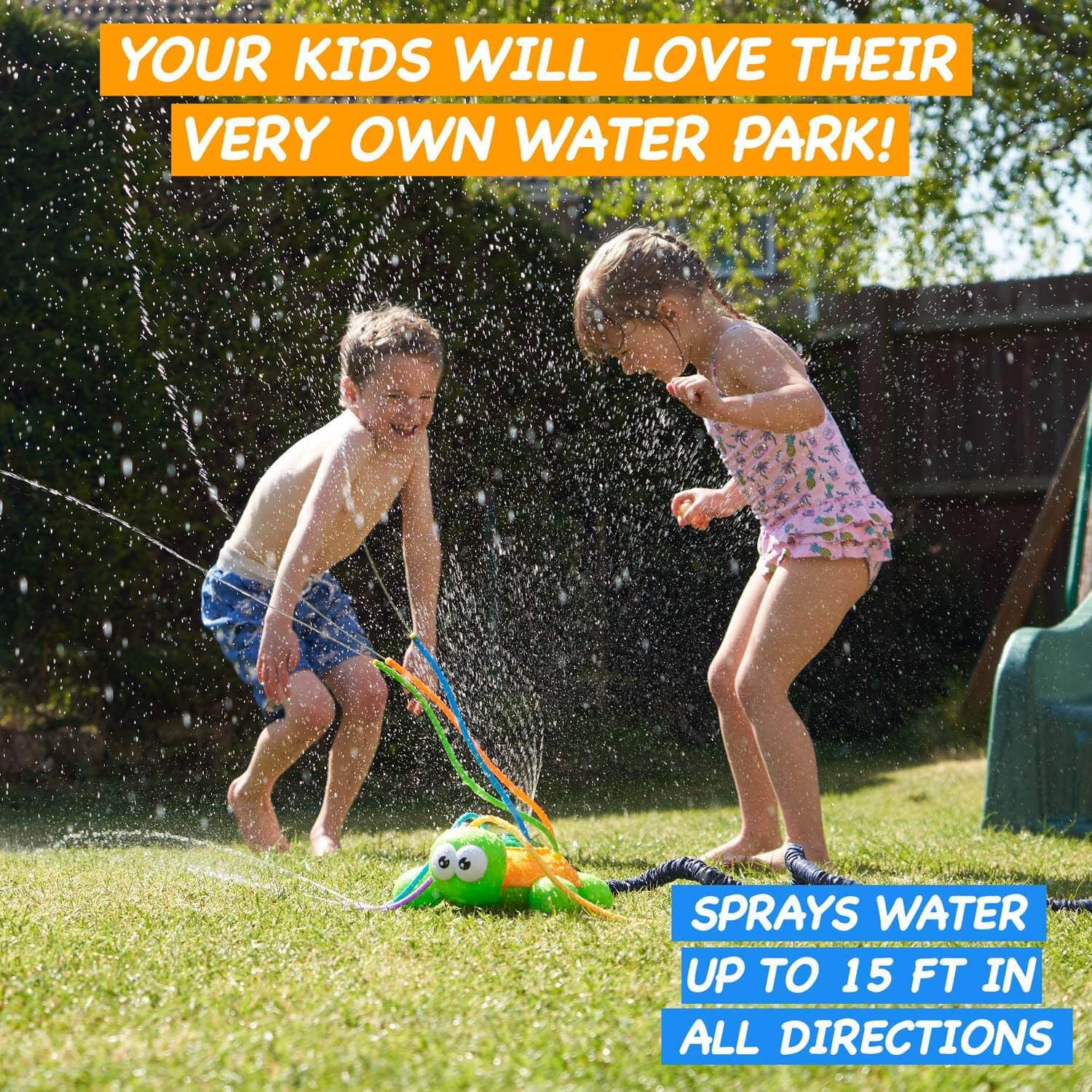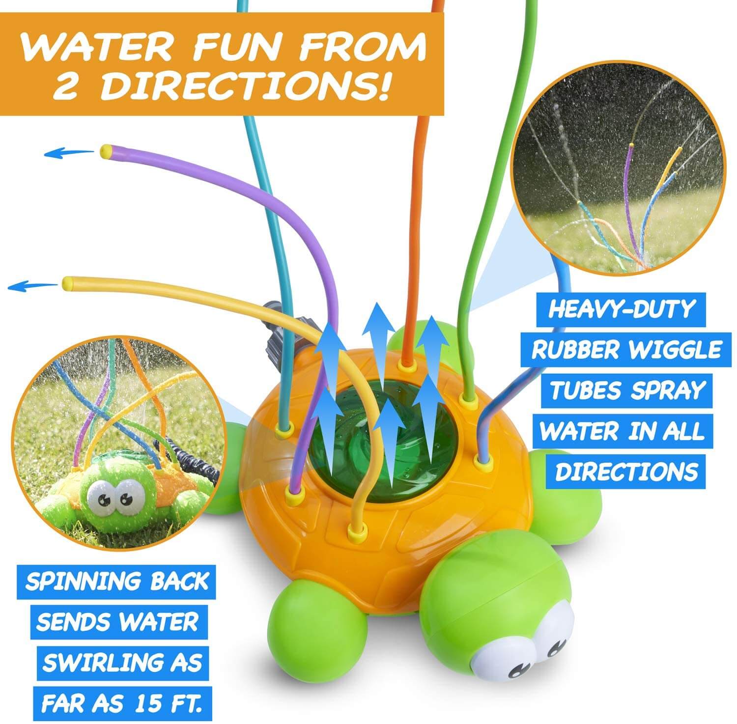 Summer has never been this much fun for the whole family. Attach the Spinning Turtle Sprinkler to your hose, turn on the water and have splashing fun while watering the lawn at the same time. This outdoor water spray has an extra wide spraying range. Twirls and Whirls are created as the water is released via the spinning back of the turtle as well as the attached wiggle tubes. Your kids will be mesmerized by the playful effect of the water as it spins and turns. Depending on the pressure of your water, the spray from this outdoor kids’ sprinkler can reach a maximum of 8 ft. Divided among many outlets, the pressure of the water which comes out of both the tubes and the holes on the turtle’s back is perfectly safe for your children and your pets. All kids aged 3+ will love this cool outdoor activity. Outdoor water toys for kids have never been so exciting. This water sprinkler is the perfect addition to your next birthday party or gathering of friends and family.